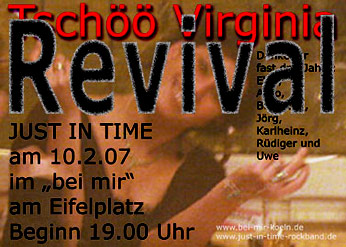 10. Februar 2007 Just In Time - Revival Nicht einmal drei Monate nach ihrer personellen Vervollständigung durch Lead-Gitarre/Gesang: Burkhard Schreiber und Lead-Gesang/Gitarre: Arno Mühlhausen, "erzwangen" die amor-bedingten Abwanderungsgelüste Virginias ein Abschieds-Konzert von Just In Time. Das Wochenende vor dem Höhepunkt der "Jecken Zick in Kölle" sollte es sein. Die Playlist umfasste, trotz der - auch noch durch die Weihnachtsferien feierlich unterbrochene - eigentlich viel zu kurze Vorbereitungszeit, immerhin Musik für gute zwei Stunden Auftritt, was nicht unbedingt gegen die musikalische wie sozialintegrative Kompetenz der neuen Truppe sprechen dürfte. Toi, toi, toi! Der Auftrittsort: Helge und Anna Beckers Kneipe "bei mir" am Eifelplatz in Köln-Süd, überraschenderweise erst zum zweiten Mal für Just In Time. Seine kaum zu überbietend gute logistische Lage zum Proberaum im Humboldt-Gymnasium und der Doppel-Achs-Hänger der Firma von Arno Mühlhausen ließ das Verbringen der Hardware zu einem relativ skelett-schonenden Ereignis werden. Zu diesem Glück gesellte sich unser, zumindestens mir, dem konkurrenzlosen Senior der Band, viele schwere Schleppwege abnehmende Riesen-Roady Lutz Rossfeld und erstmalig eine ex-professionelle Bühne, bestehend aus zwar reichlich ramponierten Bühnenelementen, die dafür dann aber auch noch leider das edle Eichenparkett der Kneipe ruinieren sollten. Viel Fummelei mit der versifften Technik dieser alten Teile ließen die Vorbereitung etwas ausufern, so dass bei Beginn des geplanten Sound-Checks doch etwas Nervosität aufkam. Offenbar energetisiert durch dieses leichte Adrenalingeschenk kreierte Arno einen hai-teck-Bierdeckel-Theken-Notenständer, der seiner Aufgabe den gesamten Abend zu vollster Zufriedenheit nachkam. Der Sound-check verlief dann auch noch unerwartet reibungslos. Eine nicht gerade mischerfreundliche Raumakustik hatte "Major" Uwe in Rekordzeit im Griff - Echt spitze! Ein weiterer Aspekt dieser besonderen akustischen Herausforderungen des Auftrittsorts "bei mir" ist sein personelles Fassungsvermögen. Selbst nachdem der größte Teil der Betischung und Bestuhlung in Arnos Hänger Platz gefunden und von Lutz auf seinen High-Tech-Haken genommen - auf der Flucht vor Knöllchen-Jägern - auf dem Humboldt-Schulhof in Sicherheit gebracht worden war: Gefühlte sechzig bis höchstens achtzig menschliche Leiber erzeugten bald in dem vier Meter breiten Schlauch ein wohliges Sardinenfeeling - wie es von den Höhen des Bühnenberges den Anschein hatte. Die Bud wor proppevoll, wie es rheinische Zungen auszudrücken pflegen. Fast auf den Punkt, wie geplant, um halb acht ertönten die Harmonien des "Roadhouse Blues" und die "Neuen" Just In Time waren nicht mehr zu stoppen. Zwei Auftritts-Blöcke mit zwanzigminütiger Pause fanden leider/gottseidank kurz nach zehn schon ihr Ende. Zum "gottseidank" später! In der Pause verabschiedeten sich unser Roady und Nachwuchsbarde Lutz mit zwei Stücken von der Weggefährtin Virginia, ebenso wie dies mit viel Applaus auch Hanna (siehe: Schottland-Gig) mit beneidenswert voluminöser Stimme tat; allerdings bekam sie drei Punkte Abzug wegen Verweigerung des Erklimmens des Bühneberges. Wer beides erlebt hat, wird es ihr verzeihen. Doch ohne Quatsch, sollten wir die noch mal verwenden(die Bühne!), dann nur noch mit Treppe. Roger gab nach Ende des Auftritts noch sein Tschöö-Virginia-Ständchen, dem Arno noch eins draufsetzte. Dass dem frühen Ende des Auftritts ein "gottseidank" gehört, lag an einem sehr klein karierten Anwohner der Kneipe, der wohl eine Sekunde nach zehn die 110 gewählt und damit einen netten Herrn von Ordnungsamt sowie eine äußerst charmante Ordnungshüterin in grün zum "bei mir" zitiert hatte. Die, nachdem ihnen nur die wohltemperierten Klänge der After-gig-party entgegensäuselten, stehenden Fußes kehrt machten und grinsend das Weite suchten. Der Gig - wie ich ihn erlebte - war eine ganz neue Erfahrung von unverkrampfter Konzentriertheit, kollektiver Aufmerksamkeit auf das Wesentliche, natürlich nicht ohne Macken, dennoch mit unerhört viel musikalischem Vergnügen, nicht zuletzt dem beim Abspann "vergessenen" Mischer "Major" Uwe zu verdanken. Wird nie wieder vorkommen(dass er vergessen wird!), ganz ehrlich! Manchmal lüge ich! Das visuelle Protokoll steuerte mit exzellentem Auge und Hand zur rechten Zeit Andreas Siejek bei (DER Schwabe in rheinischer Diaspora, der bereits beim Deep-Purple-Konzert in Dortmund, Anfang letzten Jahres seine fotografische Klasse unter Beweis gestellt hat); Siehe: De Bülder! Die Reflexe auf der After-Gig-Party von den lieben Zeitgenossen vor der PA waren ausnahmslos lobend bis euphorisch. Wenn man den C2H5OH-Faktor abzieht, waren sie durch die Bank sehr ermutigend. Stellvertretend für viele, die Bewertung unseres "ältesten" Mitstreiters Manfred von Unisono: "Das war ein Quantensprung in der Just-In-Time-Bandgeschichte!" Mit so viel rot-gelobten Ohren, die wohl auch zu guten Teilen dem erwähnten C2H5OH-Effekt zu verdanken waren, ging's ab in die Falle, von ein paar Straßen weiter, bei Elke und mir, bis nach Bochum-Herne für Arno und Frau, die beiden allerdings nur mit rot-gelobten Ohren. Schon um high-noon hieß es erneut, sich im "bei mir" zu versammeln und die Retourkutsche von gestern zu meistern. Es hat sich gelohnt. So kann's weitergehen - wir werden daran arbeiten. Euer Basser Karlheinz |