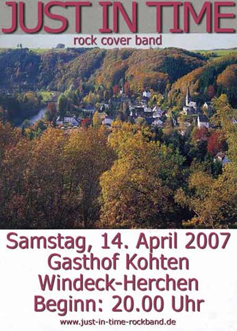 14. April 2007 Veras Geburtstag und Geschäftsjubiläum Dieses - wie ich finde, schöne - Gig-Plakat trugen wir, Elke und ich nach dem Elternsprechtag am Humboldt, am 23. März nach Windeck-Herchen, offenbar wie Eulen nach Athen, denn dort zierte dann ein ganz anderes Papier die Wände. Damit ist auch schon alles nur andeutungsweise Negative aus meiner Sicht über diesen Gig gesagt. Vera, eine Bekannte von Arno ließ bitten, zur Feier ihres ...ten Wiegenfestes und des Einjährigen Jubiläums ihres Betriebs, dem Gasthaus Kohten, in eben diesem, im idyllischen Kurort im Tal der Sieg. Ein wahrer Sommertag im April ließ nicht erst auf der Anreise von Köln erahnen, wie schweißtreibend dieses Projekt noch werden sollte. Auf ein-stimmigen Wunsch ging's diesmal erst um zwei mit dem Einladen am Humboldt los, pünktlichst und entscheidend mitbewegt durch Chef-Roady Lutz. So angenehm dieser späte Beginn des Ladens am Humboldt auf den ersten Blick erschien, er sollte sich als ein Stress steigernder Faktor herausstellen, denn: Abfahrt gegen drei, Ankunft in Herchen kurz nach vier, Abladen und Bühnenaufbau bis gegen halb sieben, und... Rüdiger mahnte mit Nachdruck den Beginn des Sound-Checks an, nicht nur das, auch noch mit Recht, denn um acht sollte es schließlich formal losgehen. Kein einziges richtiges Päuschen, Raum für einen entspannten Ortsbummel, Umkleiden und Schminken ... Probleme mit der Schlagzeugmikrofonierung, Rückkoppelungen... ließen zwar nur den Anflug von Hektik bei Mischer Major Uwe aufkeimen. Wenn auch gut überspielt, datte musse nitte sinn! Daher mein Vorschlag: Wie gehabt, Einladen so um "high noon", dann haben wir hinten hinaus mehr Luft. Und darauf kommt's schließich an, wie schon unser Altkundesbanzler, Dr. haatzee Birne Oggersheim, nicht müde wurde, uns zu erinnern. Acht Bühnenelemente, auf 50-cm-Stempeln, herausragender und dankenswerter Weise vom Sohn des Hauses bereits zu einem zwei Meter tiefen Bühnenschlauch über die gesamte Raumbreite vorinstalliert, wurden noch durch ein Element in der Mitte, hier, auf drei Meter Tiefe erweitert. Die Standard-Positionierung des Schlagzeugs, mit seinen fixen Maßen von zwei mal zwei, in der Bühnenmitte, war so, ohne die Erweiterung sowieso, nicht möglich. Unser "Größter" verschwand folglich und schließlich visuell beinahe hinter der, aus raum-akustischen Gründen auch noch Richtung Bühnenmitte gewanderten PA-Türmen in seiner linken Ecke, ursprünglich mit der verlockenden Voraussicht gewählt, so alle Mitwirkenden im Blickfeld zu haben. Doch da war schließlich auch noch der Basser vor. Welch ein microkosmisches Drama, aber immerhin - klassisches griechisches Niveau im Windeckerland. Sowohl das Befüllen und Entladen der Bühne und des sonstigen Equipments geriet zwar nicht schweißfrei (das mediterrane global-warming-Klima des April-Sommers 07 im Siegtal war schon mal dagegen), aber durch die tolle Anfahrt direkt hinter die Bühne und mit der sympathischen Toleranz des jungen Paares mit Kindern und deren Oma(?) im Nachbarhaus beträchtlich muckie-schonender als schon mal gehabt und vor allem ohne einen nächtlichen Stimmungsmacher vom Ordnungsamt nebst Freunden und Helfern in grün (Hallo, Nachbar vom "bei mir" am Eifelplatz!). Daher: Danke, liebe Nachbarn in Herchen!!! Das hatte Format. Na ja, sogar meine vergessene Notenleuchte war bei unserem dB-gesteuerten Flacker-Bühnen-Licht kein totales informationstechnisches Desaster, und, noch schlimmer, der ebenfalls vergessene Rockstand zwang zunächst zur einigermaßen sturzsicheren Ablage der guten Vigier auf dem Polster eines Kneipenstuhls, verhalf aber durch den Einsatz von Elke und einige Konnekschens im Dorf zum Erlebnis einer wahrhaften Sensation von Gitarrenständer, Metall- aber hauptsächlich Plastik-Konstruktion, von voll platt in eine absolut taugliche Form faltbar: Danke für diese schnelle Hilfe und dieses Erlebnis des Produktes einer Gitarrenständer-Designer-Sternstunde. Auf der permanenten Suche nach Flüssigkeit in Form von Wasserflaschen - von der Stirne ständig aber leis, rauschte hier der Schweiß - ging's denn so gegen halb neun zu den Arbeitsplätzen auf die Bühne und, wieder mal eine Jungfernfahrt sollte beginnen, ein Set in drei geteilt zu je acht Stücken und vier Zugaben. Das sollte sich, auf der Bühne, knapp unter der Wirtshausdecke, zumindestens in Sachen Körpertemperaturregelung und Wasserhaushalt als sehr segensreich erweisen. Nachdem der erste Block noch vor recht spärlicher Kulisse ablief, schien der akustische Eindruck im Thekenbereich doch einige Gäste mehr zum Besuch des Auftrittsraumes bewegt zu haben, im zweiten Block wurde es dort schon kuscheliger und der Ersatz einiger Tische samt Bestuhlung durch Stehtische ermunterte schließlich, vor allem die Jugend, zu einem nahezu "Ausverkauft Eindruck" von der Bühne aus beizutragen. Sogar die Zahl von tanzgeneigten Gästen nahm ebenso stetig zu, wie wohl einerseits der Allolospiegel, als auch die offen gezeigte Begeisterung einiger Musikfreunde aus meinem oder um mein Semester herum. Tja Leute, das ist halt "unsere" Musik und das ist "my generation"! Im umgekehrten Verhältnis zur Zahl der Menschen und deren Aktivitäten vor, verhielt sich die Konzentration der Akteure auf der Bühne. So wirkten sich wohl die Temperaturen, die Dauer des Gigs, die suboptimale Vorbereitung (Ferien - Urlaubs - Jetset - Proben - Abstinenz) und die üblichen Folgen des "Das Stück müssen wir doch nicht noch mal spielen, das haben wir drauf" - Denkste! in einer zunehmenden Zahl kleinerer bis submaximaler künstlerischer Katastrophen aus. Wohlwollende Zeitgenossen kommentieren das ja üblicherweise mit einem "Hat man überhaupt nicht gemerkt!" Bei so viel relativierenden Beschreibungen bleibt für mich dennoch der gefühlte Wert der Qualität dieses zwanzigsten Gigs von JIT und des zweiten in der neuen Besetzung als einer der besten, wenn nicht gar der beste, gerade in anbetracht der Einschränkungen u