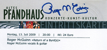 HPT-16/10-09 Roger McGuinn in Köln - Was Elke & Karlheinz erlebten - Die Legende, ein abgedroschener Begriff? - Medien HPs Bericht: Roger McGuinn im "Alten Pfandhaus" in Köln Das Wetter war angemessen, so wie man es in Florida kennt: Sonnig - etwas schwül. Man war luftig gekleidet und traf sich vor dem "Alten Pfandhaus" am Kartäuserwall in Köln, um nach jahrzehnterlanger Abstinenz den "King of 12-String" - Roger McGuinn - einmal wieder live in Köln erleben zu können. Gegen 18:30 Uhr wurden Uta und ich von Rogers Frau Camilla herzlich begrüßt, um uns nach dem Konzert "backstage" in den "green room" einzuladen. Thanks Camilla! Es wurde ein Abend voller Überraschungen. Überraschung #1: Man traf Leute, deren Namen man nur aus den Byrds-Newsgroup kannte (Thorsten), man traf Leute, mit denen man früher einmal Musik gemacht hatte (Manfred) und die man jahrelang nicht gesehen hat, und man traf Freunde, die man schon eine Ewigkeit kannte (Elke & Karl-Heinz). Nach dem Einlass folgte Die Tickets wurden umgetauscht. Jeder Besucher bekam ein neues mit dem Original Autogramm des Meisters. Wow. Man begab sich nun in die Heiligen Hallen des "Alten Pfandhauses". Zu meiner Schande muss ich gestehen, dass ich bis dato nicht einmal wusste, dass hier Konzertveranstaltungen stattfinden. Was folgte war Man hatte das Gefühl, ein vergrößertes Wohnzimmer zu betreten. In der Mitte eine kleine Bank, rechst und links davon jeweils eine Gitarre (12-string Rickenbacker Fireglow & 7-saitige Martin acoustic), Abstand ca. 1,5 m zum Publikum, hautnaher Kontakt. Um 20:00 Uhr trat ein schick gekleideter Repräsentant der Deutschlandwelle Kultur vor das Mikrofon und teilte dem Publikum mit, dass die Show "live" aufgezeichnet und Mitte August gesendet wird. Danach betrat Roger McGuinn die Bühne. Im Gegensatz zu seinem Konzert in London hatte Roger die Setliste verändert: Und das war gut so. Mehr Rickenbacker und mehr Byrds. Im Vergleich zu London reduzierte Roger die Informationen zu den einzelnen Stücken, was letztlich der Musik zu Gute kam. Es folgte ein Mix aus Byrds Klassikern: My back pages, Mr Spaceman, So you want to be a Rock'n' Roll Star, I feel a whole lot better, He was a friend of mine, Turn Turn Turn, Mr Tambourine Man, Eight Miles High, You showed me, 5 D, Lover of the Bayou, The Bells of Rhymney (watch out for the correct pronunciation!), Just a Season, Chestnut Mare, All I really want to do, You ain't going nowhere, Pretty Boy Floyd, Songs aus dem Film "Easy Rider": Wasn't born to follow, Ballad of Easy Rider, It's alright ma, und Stücke aus der Post-Byrds Ära: American Girl, The Trees are all gone, Don't you write her off, King of the Hill, und Folksongs aus seinem Folk Den Project... und, nach neuesten Informationen des Meisters: Well, Well, Well und Soldier's Joy / Black Mountain Rag (instrumental, von B. Gibson). Nachdem Roger zwischenzeitlich eine Pause einlegen durfte, weil das Publikum ihm ein "Happy Birthday" Ständchen sang, verabschiedete er sich nach gegen 21:30 Uhr mit einer bewegenden Ballade "May the Road Rise To Meet You" von einem fantastischen Publikum, das ihm "Standing Ovations" bereitete. Nun war es Zeit für die After-Show Party, Überraschung #4: Elke & Karl-Heinz begaben sich auf den Weg zum Kühlfach, aus dem sie die extra für Roger kreierte Geburtstagtorte holten. Thanks so much Elke und Karl-Heinz. You are great! Wir trafen uns dann alle Backstage, wo wir (Uta, Elke, KH und ich sowie zwei Vertreter des Radiosenders und der Chef des Alten Pfandhauses) von Camilla und Roger McGuinn empfangen wurden. Wir überreichten unsere Geschenke (ein Bildband über Köln und die Geburtstagstorte). Man servierte uns Kölsch, und Camilla schnitt die Geburtstagstorte an. Wir stießen auf Rogers Geburtstag an und unterhielten uns mit den McGuinns über das Konzert, die Tour und Gott und die Welt. Nach ca. 45 Minuten verabschiedeten wir uns von den McGuinns und bedankten uns für die Herzlichkeit, die sie uns allen entgegenbrachten. Der 13. Juli 2009 wird immer in unserer Erinnerung bleiben und es bleibt die Hoffnung: "May the Road Rise to Meet you“, bald wieder. HPS