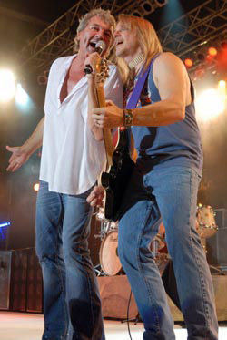 Auf dem einzigen Album von Line Up Mk IV kommunizierte Bolin musikalisch nicht nur via E-, Slide- und Rhythmus-Gitarre, sondern sang auch einige Vocals ein. Mit Ausnahme von „Lady Luck“ und „You Keep On Moving“ war der im eigentlichen Wortsinne viel-saitige Amerikaner auch stark in das komplette Songwriting involviert. „COME TASTE THE BAND“ hatte Spannung und Groove und bot in Teilen durchaus einen aufregenden und sehr gelungenen Mix aus unterschiedlichen Stil-Elementen: Hardrock goes funky Jazz! Mit Bolins Eintritt wurden nie gekannte Funk-Einflüsse mit dem Hardrock- und Blues-Sound von DEEP PURPLE fusioniert. Man höre nur den dritten Track auf dem Album, „Gettin’ Tighter“ funkier geht’s wirklich nimmer! Stilistisch in der selben Kerbe: „I Need Love“. Traditionell eingestellten DP-Fans gefiel diese Entwicklung jedoch immer weniger. Ohne Zweifel auf der Habenseite: Der Opener des Albums, „Comin’ Home“, den Bolin in der Introduktion mit elektronischen Soundverfremdungen und gelungenen Wah-Wah-Verzerrungen verpackte und „Lady Luck“ mit einem stark engagierten Coverdale. Glanzpunkte: „Love Child“ mit einem straighten, ohrwurmartigen Riff, das Bolin allerdings ‚geleast’ hatte und einem David Coverdale, der den feucht-schlüpfrigen Text („Squeeze ‚n’ tease me, honey, when you shake your body“) bis an die Grenze zur Heiserkeit erotisierte. „You Keep On Moving“ ist der atmosphärisch dichteste Song des Albums und entstammt der Feder Coverdale/Hughes: Geheimnisvoll gezauberte Keyboardstimmungen von Lord, Bolins ganze Magie auf Slide- und E-Guitar, poitisch-wehmütige Lyrics in einprägsamen, melodischen Gesangslinien. Misterwerk für die Purple-Galerie! Bemerkenswert: „Dealer“ und „Drifter“, da hier Motive in den Songtexten aufgegriffen wurden, die im Schaffen DEEP PURPLEs in loser Folge immer wieder auftauchten. In stimmiger Weise wurde die Thematik des ‚Drifters’, des ziel- und planlos umhertreibenden Menschen, des Außenseiters, der nirgendwo wirklich zugehörig ist, packend in Songtexte und kongeniale Musik umgesetzt. Vereinsamte, verarmte und gebrochene Helden und Nonkonformisten, die an den gesellschaftlichen Regeln scheitern, finden wir in „Child In Time“, „When A Blind Man Cries“, „Mistreated“ oder „Soldier Of Fortune“. Trotz der zuvor genannten Highlights ob der so eklatant akzentuierten Funk-Einflüsse hing die Zustimmung oder Ablehnung des Werkes schlicht vom jeweiligen Musikgeschmack des Hörers ab. Fakt war, dass der Sound der britischen Hardrock-Institution nun noch weiter von den ursprünglichen Band-Wurzeln entfernt war. Des weiteren war Bolin nicht nur am Instrument und ob der Haarpracht eine schillernde Persönlichkeit. Er nahm Drogen (Heroin), verhehlte dies aber über längere Zeit geschickt gegenüber seinen Bandkollegen. Erst spät merkte die Band, was los war zuerst schenkte man den Ausreden Bolins noch Glauben. Es gab Konzerte, die belegen, dass Bolin gerade mal die elementarsten Griffe spielen konnte, um einen Purple-Song überhaupt noch identifizierbar zu machen. Am 15. Dezember 1975 wurde in Japan ein Album mitgeschnitten, das unter dem Titel „LAST CONCERT IN JAPAN“ erst im März 1977 veröffentlicht wurde. Hier ist das Dilemma akustisch nachvollziehbar: Lord sprang mit Hammond-Soli bei den Passagen ein, die Bolin auf der Gitarre nicht mehr spielen konnte! Dann wiederum gab es auch brillante Darbietungen von Bolin, aber sein Leistungspotential schwankte gravierend. Auf der USA-Tour im Januar 1976 präsentierte sich Bolin in glänzender Verfassung. Schwer traf den sensiblen Bolin die gnadenlose Ablehnung der englischen Fans während der England-Tour im März (fünf Dates), die lauthals ihren Unmut kundtaten und nach Blackmore skandierten. Bolin kam mit dem Druck, der auf ihm bürdete, nicht zurecht. Live traten DEEP PURPLE in Liverpool am 15. März 1976 zum letzten Mal auf. Die Bandleistung war katastrophal, unter Tränen ging damals Sänger Coverdale von der Bühne und verkündete seinen Abschied von der Gruppe! Coverdale im O-Ton: „Ich hatte es am Schluss leidlich satt, mir die Eier für Nichts rauszubrüllen...!“ Das Management brauchte länger, um der Öffentlichkeit die Fakten zu präsentieren. Am 6. Juli wurde per Presseerklärung offiziell bekannt gegeben, dass die Ära von DEEP PURPLE zu Ende sei (angeblich „auf dem Höhepunkt ihres Erfolges“). Tommy Bolin ging mit der TOMMY BOLIN BAND auf Tour seine Arbeitskraft schien ungebrochen. Im Studio und auf der Bühne war er mit diversen Projekten und Konzerten permanent präsent. Da er aber auch noch alkoholabhängig wurde, nahm seine persönliche Tragödie den unvermeidlichen Lauf. Am 10. Dezember wurde Tommy Bolin in derselben Stadt zu Grabe getragen, in der er 25 Jahre zuvor geboren wurde in Sioux City, USA. Nur ein paar Tage zuvor spielte er dort am 24. November 1976 noch ein beeindruckendes Konzert. 1980 versuchte der erste Sänger, Rod Evans, unter dem Namen DEEP PURPLE ein Comeback, das mehr als kläglich scheiterte und deswegen hier keine weitere Erwähnung finden muss. ‚Richtig’ weiter ging es erst im Jahr 1984, als das Mark II Line Up original wieder auferstand und mit der Zelebration von „PERFECT STRANGERS“ eines der triumphalsten Comeback der Rockgeschichte feierte. Teil IVIm Sommer 1976 hatte das Management offiziell das Ende der Ära DEEP PURPLE verkündet. Über Jahre berichteten einschlägige Medien immer wieder über eine angebliche. Fakt ist, dass sich Musiker und Manager 1983 zu einer Besprechung einer Wiedervereinigung getroffen hatten. Im Oktober 1984 kam ein künstlerisch eindrucksvolles und selbstbewusstes Album von DEEP PURPLE auf den Markt: „PERFECT STRANGERS“. Sensationell: Das Mark II Line Up, das zwischen 1969 und 1973 für die absoluten Highlights der Purple History verantwortlich zeichnete, fand original besetzt mit Ian Gillan, Jon Lord, Ritchie Blackmore, Roger Glover und Ian Paice