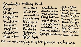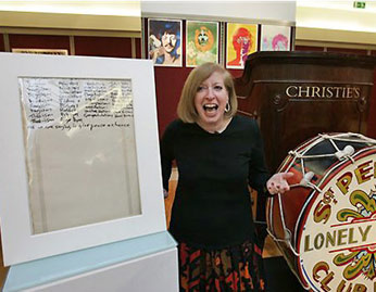 Lennon's 'Give Peace a Chance' Lyrics To Be Sold When John Lennon gave Gail Renard the scribbled lyrics to "Give Peace a Chance" in 1969, he told the teen to hold on to the piece of paper. Valuable: The Give Peace A Chance Lyrics by John Lennon could sell for £300,000 "It will be worth something someday," predicted Lennon, who was in the midst of his famous eight-day "bed-in" with his new wife, Yoko Ono, in Montreal. She did, and it is. Christie's plans to auction the lyric sheet in July as the centerpiece in its rock and pop memorabilia sale. The words to the enduring peace anthem are expected to fetch more than $400,000. The lyrics will go on public view July 5 in London and will be auctioned July 10. They will also be available for viewing by appointment in New York on May 7-10. "I think the interest is there because this is certainly one of the most recognizable and influential of John Lennon's solo compositions," said Helen Hall, head of the popular culture department at Christie's South Kensington. "It's important not just as one of Lennon's most famous peace anthems, it's also the fact that it was written at such a historical event." Few believe the lyric is an example of great songwriting. The Beatles had moved beyond their cute moptop phase and their psychedelic infatuation, but were close to breaking apart as Lennon, heavily influenced by Ono, became a utopian peace activist. Determined to focus world attention on the war in Vietnam, the newlyweds moved into suite 1742 at the Queen Elizabeth Hotel and invited the world's media to come interview them. Renard, a teenage fan who sneaked past security guards, was among the first to arrive. She befriended Lennon, helped look after Ono's young daughter, Kyoto, and made copies of the song Lennon wrote during the "bed-in" so their friends could read the lyrics and record it in the room. Star struck: Gail Renard was given the lyrics by Lennon in Montreal Renard, now a British-based TV writer and presenter, developed a lifelong friendship with Lennon, who helped launch her journalism career by placing an article she wrote about the bed-in in the Beatles Monthly magazine. She is also selling some rare photographs of herself with Lennon and Ono. The actual recording of "Give Peace a Chance" took about five minutes. It became a worldwide hit after it was touched up in the studio. A number of famous guests, including Timothy Leary, Allen Ginsberg and Tommy Smothers, sang on the record, which went to No. 14 on the Billboard charts. It was released as a song by the Plastic Ono Band, signaling Lennon's growing disenchantment with the Beatles, particularly longtime songwriting partner Paul McCartney. The song is a simple, casual affair recorded without any of the Beatles' typically high level of musicianship and artistry, but the phrase "Give Peace a Chance" has entered the popular lexicon, surviving long after Lennon's death in 1980. Hall said it ranks with "Imagine" as one of Lennon's most popular songs. She said the prices paid for Beatles' lyrics continue to rise as a new generation discovers the works of Lennon and McCartney. "It's interesting to see the reach The Beatles have," she said. "We're seeing a lot of buyers in their 30s and 40s who didn't grow up listening to them." Original handwritten lyrics to one of John Lennon's best known songs sold in London Thursday for $841,000. The price outstripped auction house Christie's estimate of up to $600,000. July 10: Writer Gail Renard in front of the handwritten lyrics for the song "Give Peace A Chance" by John Lennon that was sold in a Christie's auction in London. The words the former Beatle wrote to his anti-war anthem Give Peace a Chance were auctioned by a woman who snuck into his Montreal hotel room in 1969 when she was just a teenager. John Lennon and Yoko Ono were in town staging their "bed-in" for world peace when Gail Renard and her friend managed to sneak past hotel security. "And suddenly … we were in the room with John Lennon. And that was quite a moment. Not for him but for me," Renard told CBC News. Renard ended up spending eight days with the couple, running errands and taking care of Ono's young daughter. She was there when Lennon penned Give Peace a Chance, a song that would become a rallying cry in the anti-Vietnam War fervour of the time. Lennon gave Renard his lyrics on a large cue card for a singalong. "He kept on saying, 'These things are going to be worth something someday. Have them,' " she said. Renard, now a U.K.-based TV writer and presenter, told CBC News that Lennon negotiated with her mother, to get permission for her to stay with him and Ono. "I had to ring my mother," she recalled. "She ended up speaking to John. You wouldn't want to cross my mother a tough little lady." The lyrics were sold as part of an auction of rock memorabilia that included pants worn by Jimi Hendrix and dozens of photos of the bed-in for peace taken by Renard. The auction fell on the day chosen by the city of Liverpool as Beatles Day. The Beatles's home town celebrated their achievements Thursday on the 44th anniversary of their triumphant homecoming after conquering the United States in 1964. |