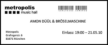 Die Anreise Nachdem Jack Bruce in Edinbvrgh unsere privaten Konzert Besuchs Maßstäbe derart neu definiert hat, dass beinahe Zepp im Madison Square Garden (wenn es denn wahr geworden wäre) unsere "Land-of-the-free-Phobie = nach uusa bringen mich keine tausend Pferde!" korumpiert hätten, wären Amon Düül II in Wolverhampton, Cardiff, Manchester oder Frome, vom 16. bis 20. März 2010, in der Mitte Englands, ganz locker als "a very convenient little picnic tour" durchgegangen. Doch da der Tourplan der legendären Musik Kommune aus der Metropole des blau-weißen Freistaates nach vielen Jahren mal wieder ein Heimspiel vorsah, zogen wir die Anreise zu ihrem letzten Konzert im metropolis in München-Haidhausen vor, nicht, weil es summa summarum viel billiger zu haben wäre immerhin verschwinden auch dafür die Zwangsabgaben für zwei Tankfüllungen im Staatssäckel aber die 1.100 Kilometer vom und zum Hohen Westerwald für Elke und mich, noch mehr die 1.300 für Uwe von Köln aus, ließen sich äußerst komfortabel bei meinem Bruder an der schwäbisch-bayerischen Donau, 150 Kilometer vor München in drei gemütliche Etappen teilen. Nach dem O.K. meines lieben Verwandten ersten Grades und seiner Chefin für zwei Übernachtungen, nach drei Karten per Internet, schon im Januar beim metropolis direkt (ohne Aufschlag!) erstanden und prompt ins Postfach erhalten - die müssen nur noch ausgedruckt werden. Als ich das am Tag vor dem Konzert tun möchte, ist die Mail verschwunden. (Leute, denkt daran, Eure E-Post-Kiste so zu instruieren, dass sie Mails nicht ungefragt, wie meine von der Telecom(!*!), nach 90 Tagen löscht.) Ein Anruf beim Betreiber des metropolis kreiert jedoch umgehend Entwarnung: Wenn der für den Internet-Karten-Verkauf Zuständige den Zahlungsnachweis gefunden hat, wird unser Name an der Abendkasse erscheinen. Umständlich geht’s also 2.0 auch ganz gut... ...und so sieht dann eine aufgefrischte, elektronisch auf Zellulose generierte Eintrittskarte aus. |