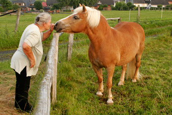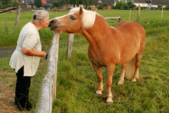 Sicher nicht zur 'reinsten Freude' (Originalton) ihres Menschen Vaters wartete sie dann auf eine Handvoll Möhren. Immerhin hatte ihre Leichtfutterigkeit am Ende jeden Sommers - und wir waren nicht die einzigen Wanderer, die ihr etwas "Gutes" tun wollten - ein beachtliches Übergewicht dieses beeindruckend ursprünglichen Haflinger Exterieurs zur Folge. Über Winter, im Stall, muss sie regelmäßig kräftig abspecken.
