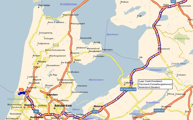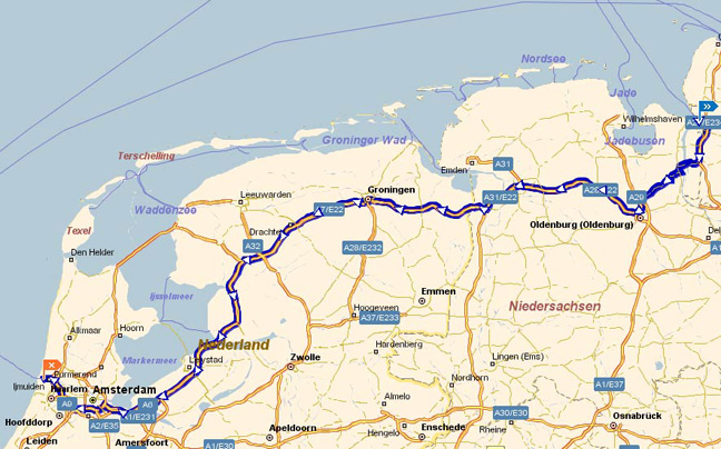 Fahrstrecke nach IJmuiden für die Nordlichter: Fahrzeit ab Bremerhaven ca. 4 bis 4 1/2 Stunden Über die A29 und A30 Richtung Holland, Da es bei Amsterdam ein wenig komplizierter wird auch für Euch eine Vergrößerung: Hinter Amsterdam stoßt Ihr auf die selbe Autobahn, die der Rest auch nutzt, daher könnt Ihr Euch dann an der anderen Route orientieren. Noch einmal aufpassen, damit keiner die Abfahrt von der Autobahn verpasst.... ...noch kurz auf dem Hafenplan orientieren, immer Richtung Sluizen, dann dürften wir pünktlich sein. DFDS SEAWAYS (die Fähre) ist extrem pünktlich, |